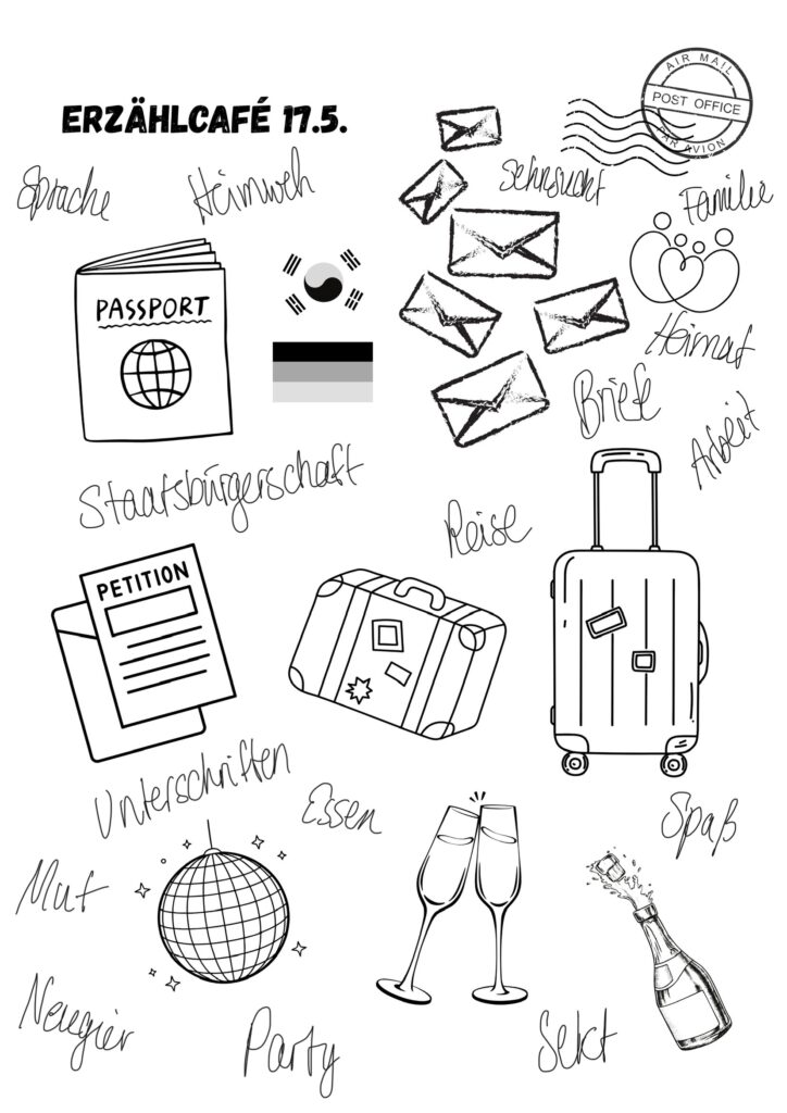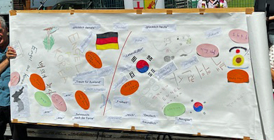 Diese Themen dienten lediglich zur Orientierung. Im ersten Erzählcafé sind wir von der Aufgabe ausgegangen, Gefühle in Korea vor der Migration nach Deutschland und Gefühle in Deutschland nach der Migration zu benennen. Auch die Interviewer*innen haben diese Aufgabe erfüllt, allerdings aus ihrer Erfahrungshorizont bzw. ausgehend von ihrem Ursprungsland. Diese Gefühle wurden aufgeschrieben und auf ein Banner geklebt, das die Reise von einem geteilten Korea in ein geteiltes Berlin darstellen sollte.