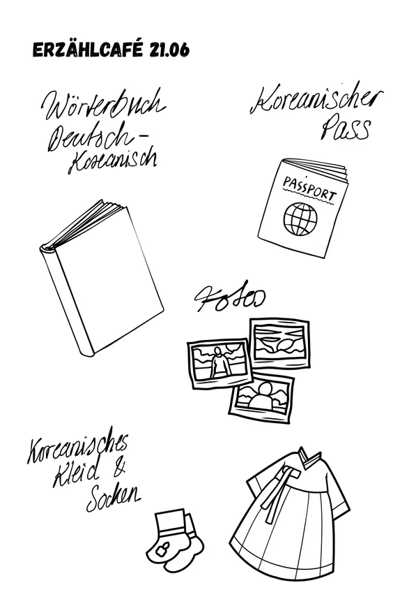 Im zweiten Erzählcafé war die Ausgangsaufgabe das Mitbringen von Objekten, die die eigene Migrationsgeschichte erzählen: Fotos, Kleidungsstücke, einen entwerteten Pass, ein Taschenwörterbuch etc. Im vierten Erzählcafé haben die Krankenschwestern selbst entschieden, über die Frage: