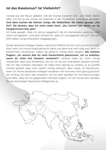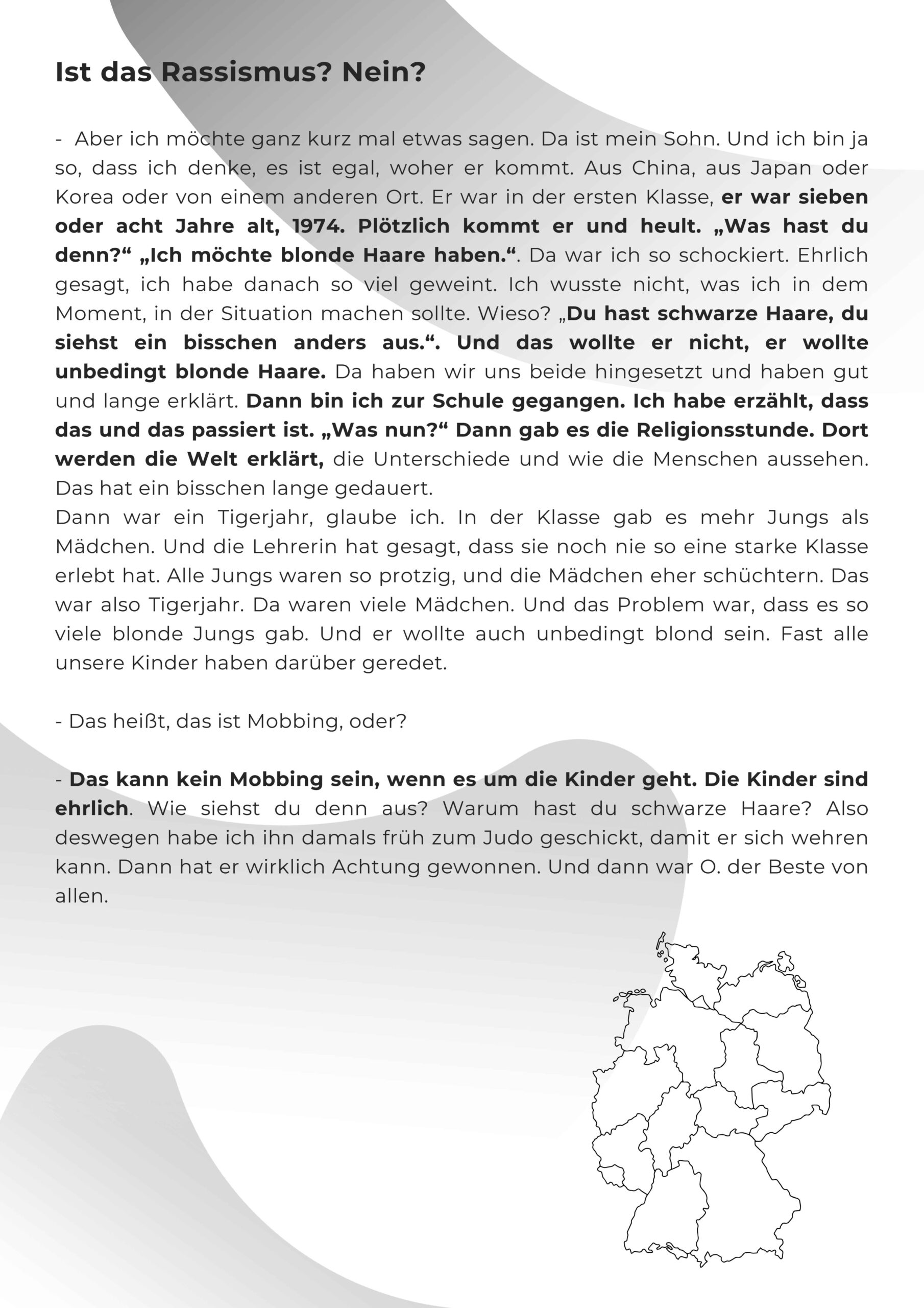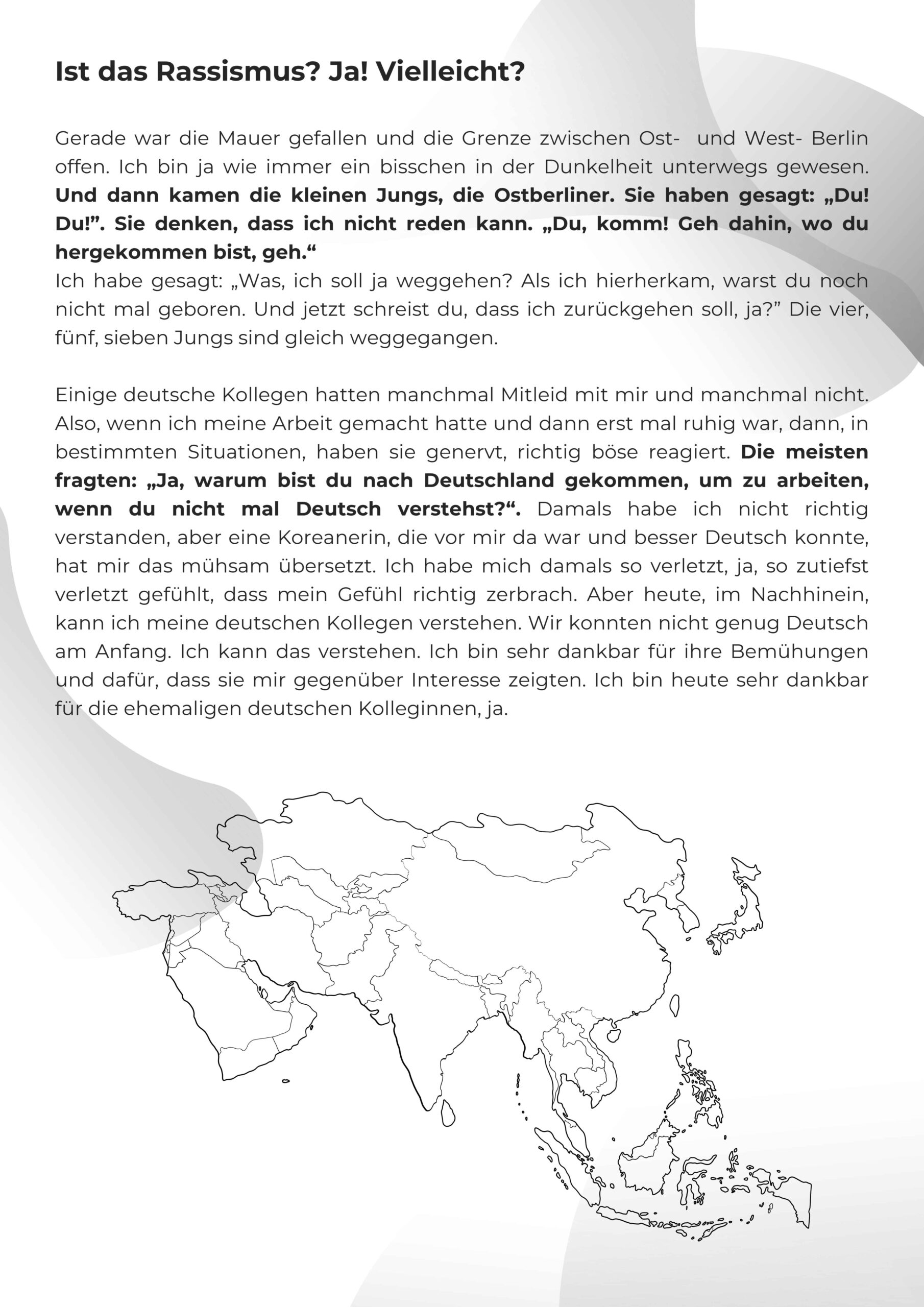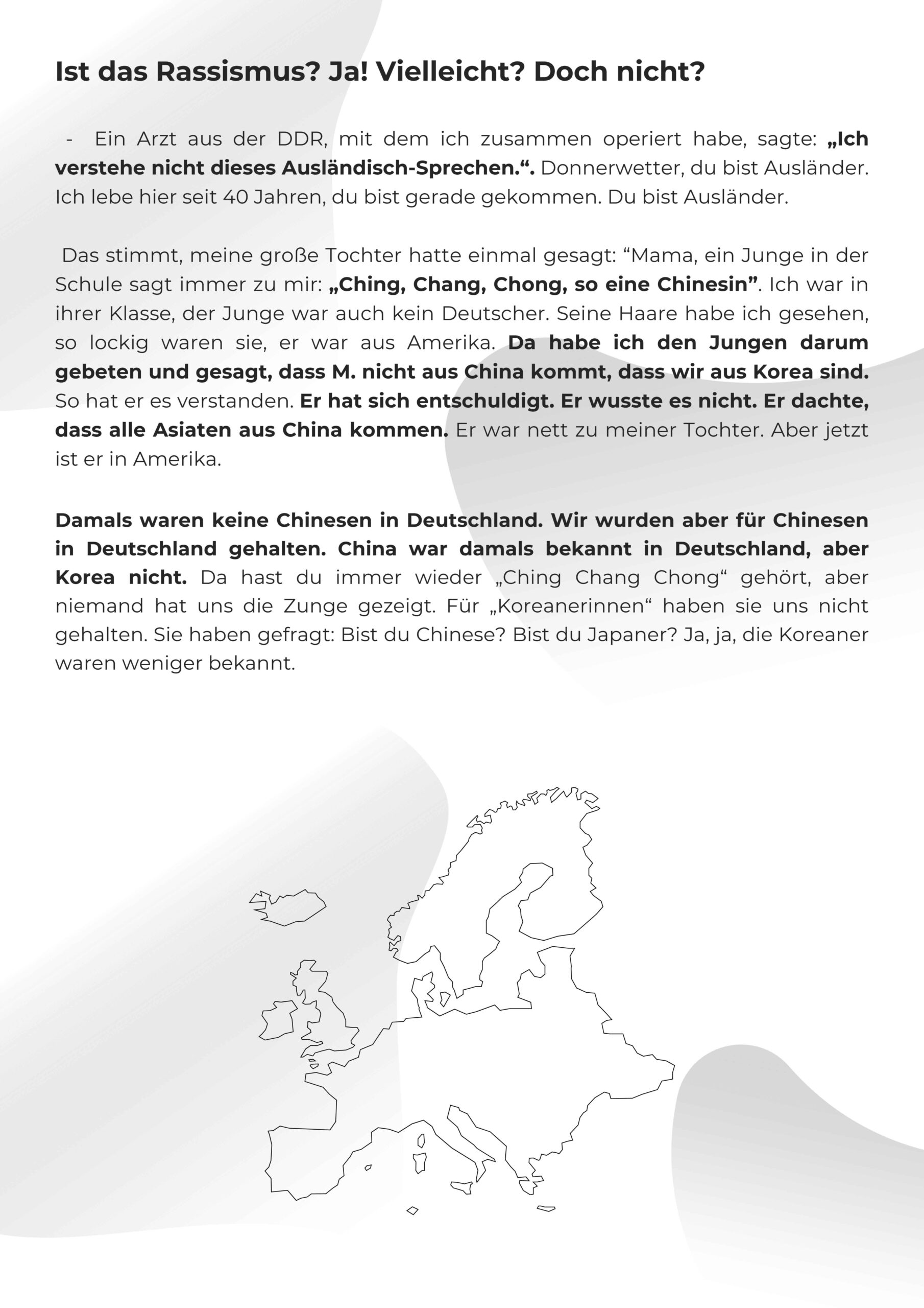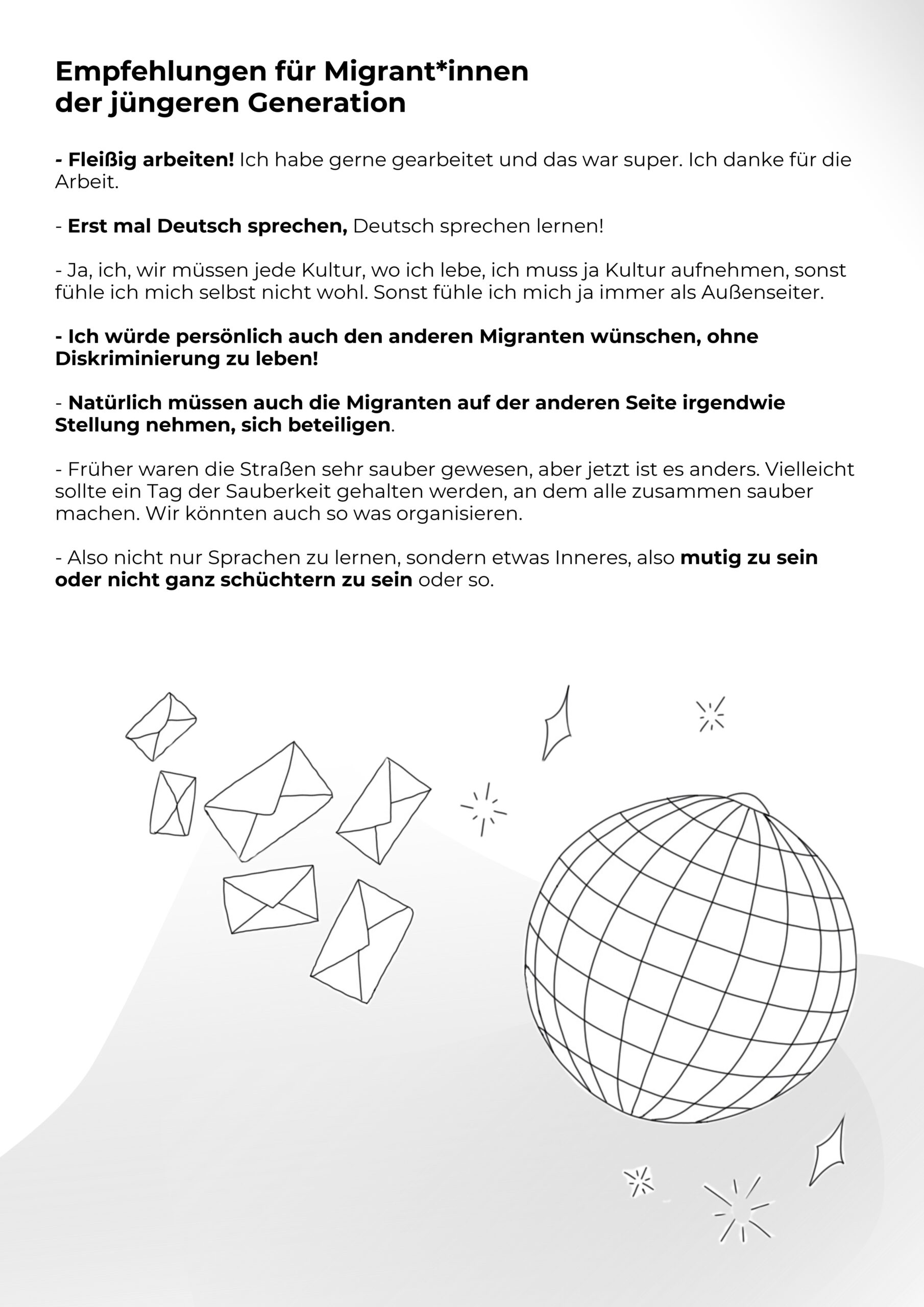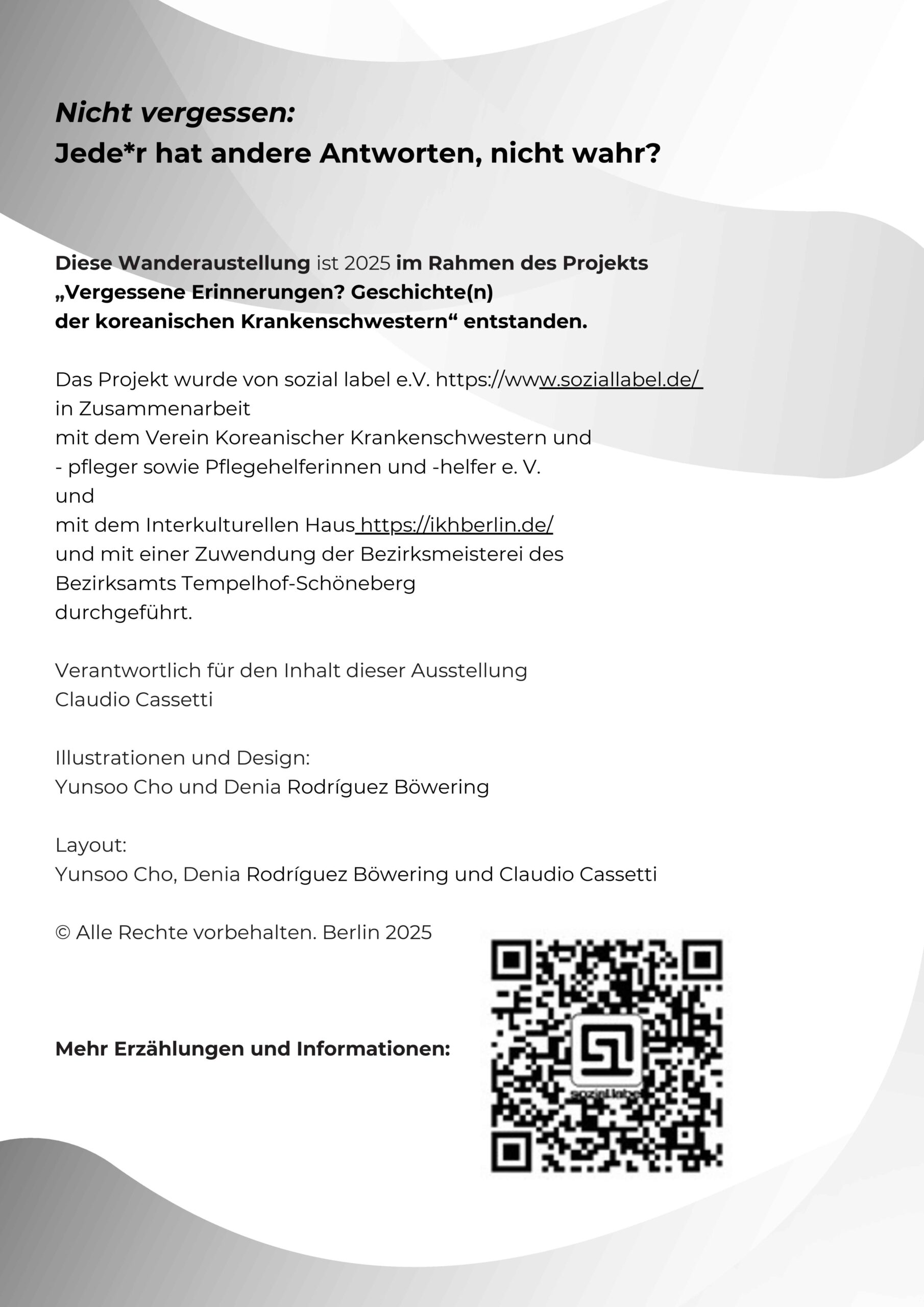 Die Wanderausstellung ist eine Auswahl von Zitaten der kollektiven Erzählung, die auf kritische Fragen hinweisen sollen, die viele andere Menschen mit und ohne Migrationsgeschichte und unsere Gesellschaft betreffen.